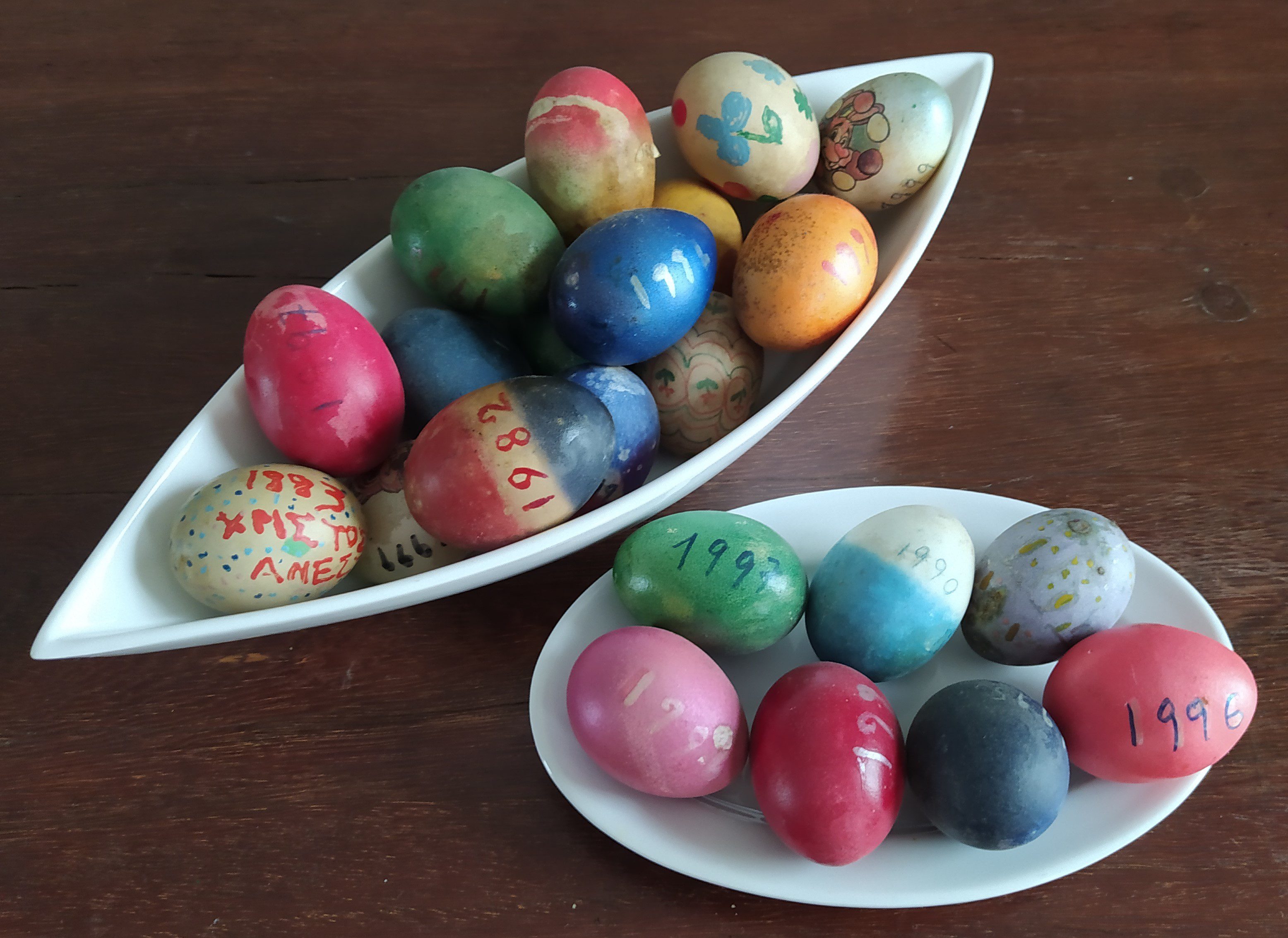 Την πεθερά μου δεν τη γνώρισα, αλλά κάτι μέρες σαν αυτή, την έχω εδώ, μπροστά μου. Όχι στατική, σε πορεία. Πορεία στο χρόνο, μέσα σ’ ένα μονοπάτι γεμάτο αυγά. Το κίτρινο γράφει πάνω 1988 και το πράσινο 1997. Για το 1996 υπάρχουν έξι αυγά, για το 1999 τρία, ενώ για το 2000 μόνο ένα, διαφορετικό από τ’ άλλα. Είναι που δεν ξανά έβαψε αυγά από τότε.