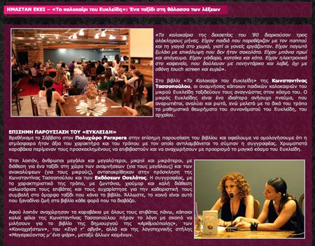 Το ταξίδι εκείνου του απογεύματος ολοκληρώθηκε, αλλά όχι το ταξίδι του Ευκλείδη, ο οποίος σας καλεί να ανακαλύψετε και εσείς τα μαγικά του καλοκαίρια και ποιος ξέρει… τα μαγικά σας καλοκαίρια μπορεί και να βρίσκονται μέσα στις λέξεις που μοιράζεται με τους αναγνώστες η Κωνσταντίνα Τασσοπούλου.