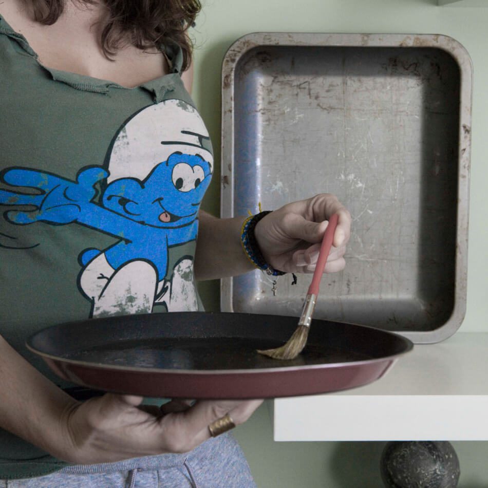Μέ ταξιδεύει τούτη η οσμή. Πρωινά στην εξοχή, δέντρα, κλαδιά, αρμονικά χωριά και βάδισμα ανέμελο σε δάση. Παραμονεύει πάντοτε μια Ψιψινέλ στο βάθος μα όχι ικανή να χαλάσει τη βόλτα. Σκεπάζω με το καπάκι κι αφήνω το μίγμα να ξαποστάσει. Αν ξέμεινε κάνα στρουμφάκι μέσα θα έχει λαχανιάσει με τόσους γύρους. Χτυπάω αυγά, τριμμένο κεφαλοτύρι, ένα κομμάτι έμενταλ, ξεχασμένο στο ψυγείο. Τά ρίχνω μέσα κι ανακατεύω καλά, να γίνουν ένα. Ένα γίνονταν κι αυτά όταν τ’ απειλούσε ο Δρακουμέλ πως θα τά κάνει σούπα ή στο φούρνο, ψητά. Στους 200 βαθμούς τον έβαλα, να ζεσταθεί καλά. Λαδώνω ένα ταψί, λαδώνω κι άλλο. Μού βγήκε μπόλικο υλικό και φτάνει για δυο πίτες. Μια στην επάνω σχάρα, μια στην κάτω. Μια για το σπίτι, μια για το γραφείο.