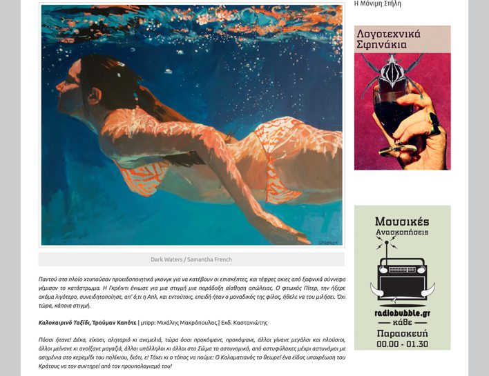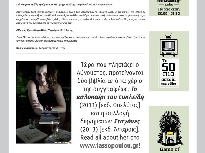 Σερβίρουμε μικρά αποσπάσματα από βιβλία που μας άρεσαν για να πάρετε μια γεύση και να σας ανοίξουμε την όρεξη να τα καταναλώσετε ολόκληρα. Σε γκεστ εμφάνιση πίσω απ’ το μπαρ η συγγραφέας Κωνσταντίνα Τασσοπούλου, επιλέγει τα (καλοκαιρινά) σφηνάκια αυτής της εβδομάδας.