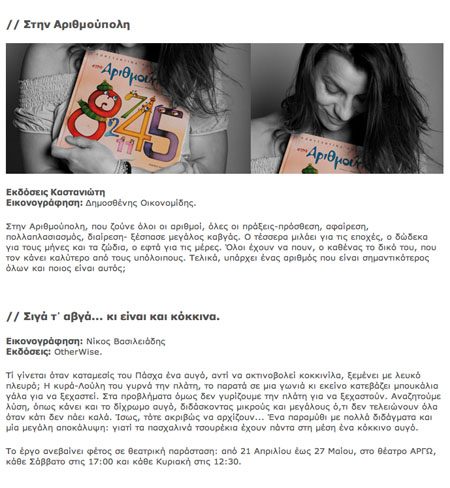 // Στην Αριθμούπολη Εκδόσεις Καστανιώτη Εικονογράφηση: Δημοσθένης Οικονομίδης. Στην Αριθμούπολη, που ζούνε όλοι οι αριθμοί, όλες οι πράξεις-πρόσθεση, αφαίρεση, πολλαπλασιασμός, διαίρεση- ξέσπασε μεγάλος καβγάς. Ο τέσσερα μιλάει για τις εποχές, ο δώδεκα για τους μήνες και τα ζώδια, ο εφτά για τις μέρες. Όλοι έχουν να πουν, ο καθένας το δικό του, που τον κάνει καλύτερο από τους υπόλοιπους. Τελικά, υπάρχει ένας αριθμός που είναι σημαντικότερος όλων και ποιος είναι αυτός;