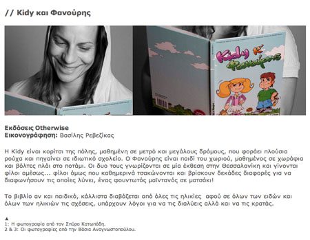 // Kidy και Φανούρης Εκδόσεις Otherwise Εικονογράφηση: Βασίλης Ρεβεζίκας Η Kidy είναι κορίτσι της πόλης, μαθημένη σε μετρό και μεγάλους δρόμους, που φοράει πλούσια ρούχα και πηγαίνει σε ιδιωτικό σχολείο. Ο Φανούρης είναι παιδί του χωριού, μαθημένος σε χωράφια και βόλτες πλάι στο ποτάμι. Οι δυο τους γνωρίζονται σε μία έκθεση στην Θεσσαλονίκη και γίνονται φίλοι αμέσως… φίλοι όμως που καθημερινά τσακώνονται και βρίσκουν δεκάδες διαφορές για να διαφωνήσουν τις οποίες λύνει, ένας φουντωτός μαϊντανός σε ματσάκι! Το βιβλίο αν και παιδικό, κάλλιστα διαβάζεται από όλες τις ηλικίες αφού σε όλων των ειδών και όλων των ηλικιών τις σχέσεις, υπάρχουν λόγοι για να τις διαλύεις αλλά και να τις κρατάς.