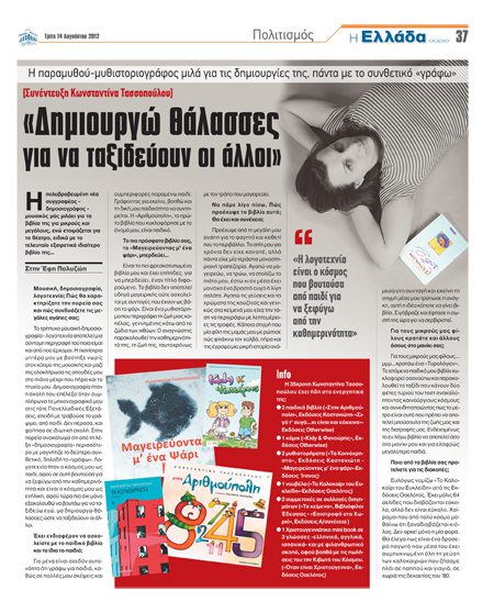 Την περίπτωση Κωνσταντίνα Τασσοπούλου την ανακάλυψα μέσα από τα σύγχρονα αθηναϊκά παραμύθια, μια πρωτοβουλία των Μητροπολιτικών Ιστοριών στην οποία συμμετείχε με την ιστορία της «βρόμικη σχέση». Τα παραμύθια μας ανέβηκαν στο Ίδρυμα Κακογιάννη και το δικό της έγινε το αγαπημένο μου. Η Κωνσταντίνα έχει το νου της στο παιδί γι’ αυτό και μας μιλά για αριθμοκαταστάσεις, πασχαλινά απρόοπτα και φιλικά μπερδέματα αφήνοντας δυο λόγια δίπλα από τους τίτλους των παραμυθιών της. Εσείς, επισκεφτείτε τη σελίδα της www.tassopoulou.gr για να ανακαλύψετε ακόμα περισσότερα για μια από τις πιο οξυδερκείς και τρυφερές λογοτεχνικές ψυχές του καιρού μας.